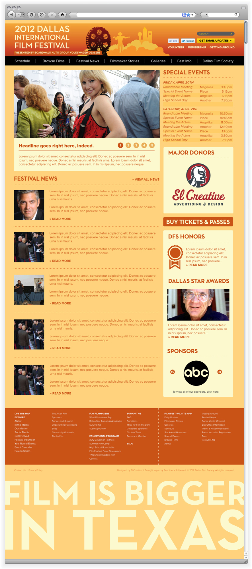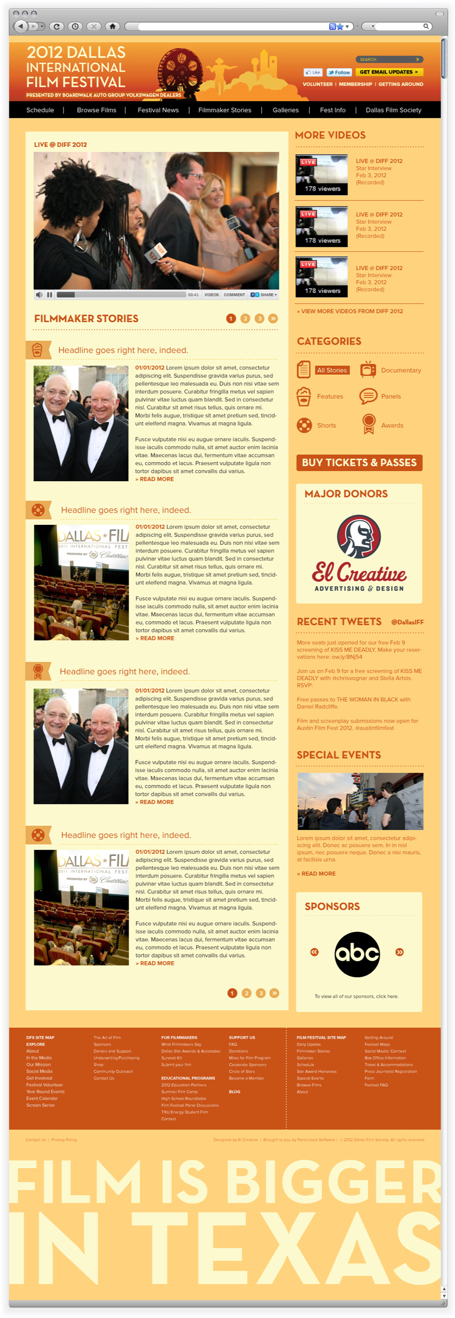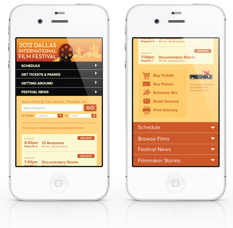 The Dallas International Film Festival needed an adaptive website. This was my first chance to design for responsive web, and it was an exciting challenge. The layout of the site changes depending on what device the user views it on in order to make the content more readable and usable.