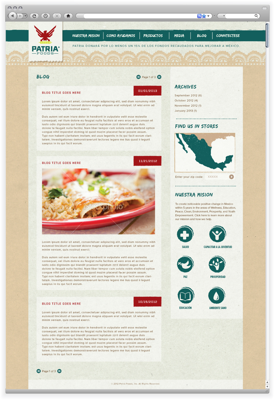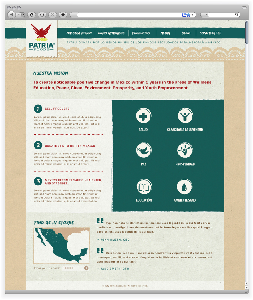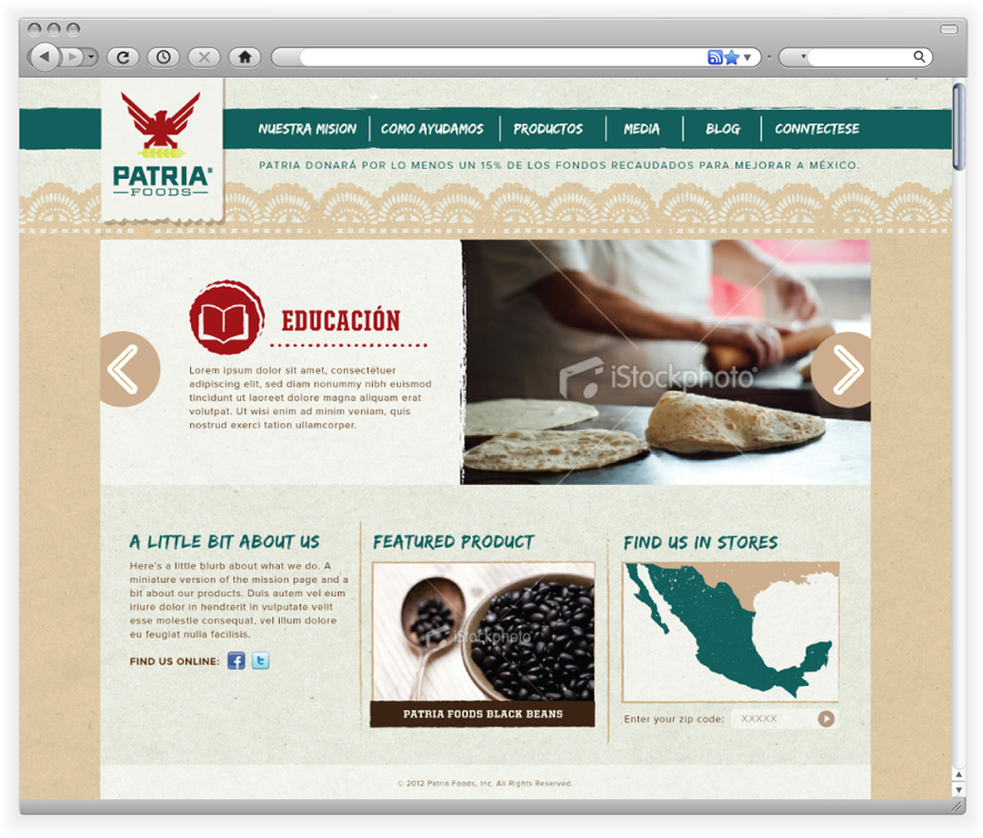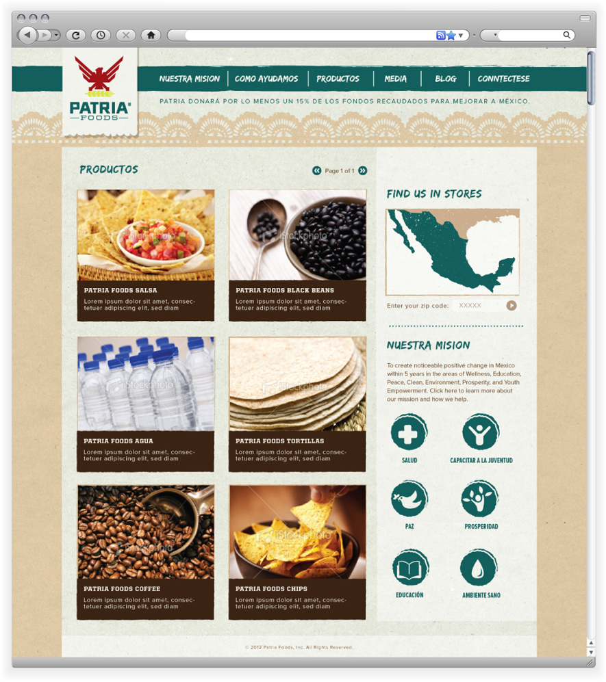 Patria Foods is a company that gives back to their home country, Mexico. With every purchase a percentage goes back to aiding their causes. This website is in the preliminary stages, and is awaiting content.